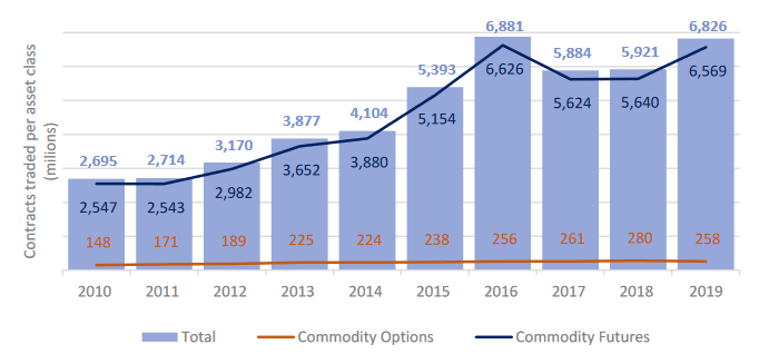 Commodity trading is one of the most widespread types of derivatives trading. In 2019, about 6.8 billion commodity derivative contracts were traded. About 95% of these contracts were commodity futures.